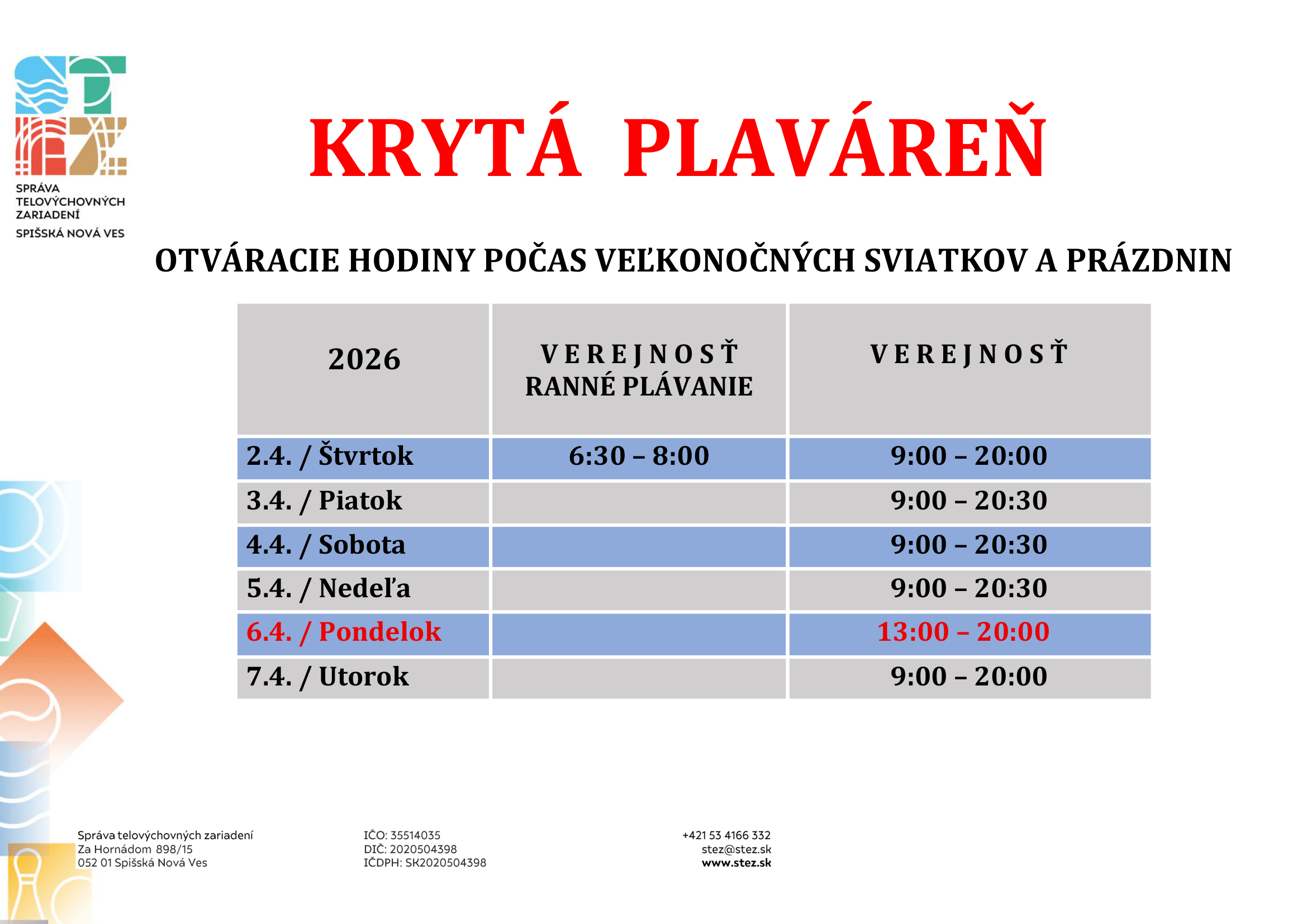 KRYTÁ PLAVÁREŇZ DÔVODU KONANIA PLAVECKÝCH PRETEKOV BUDE DŇA 4.4.2026 (SOBOTA) OD 9:00 – 13:00 ZATVORENÁ